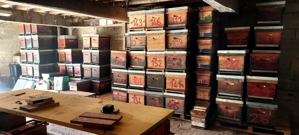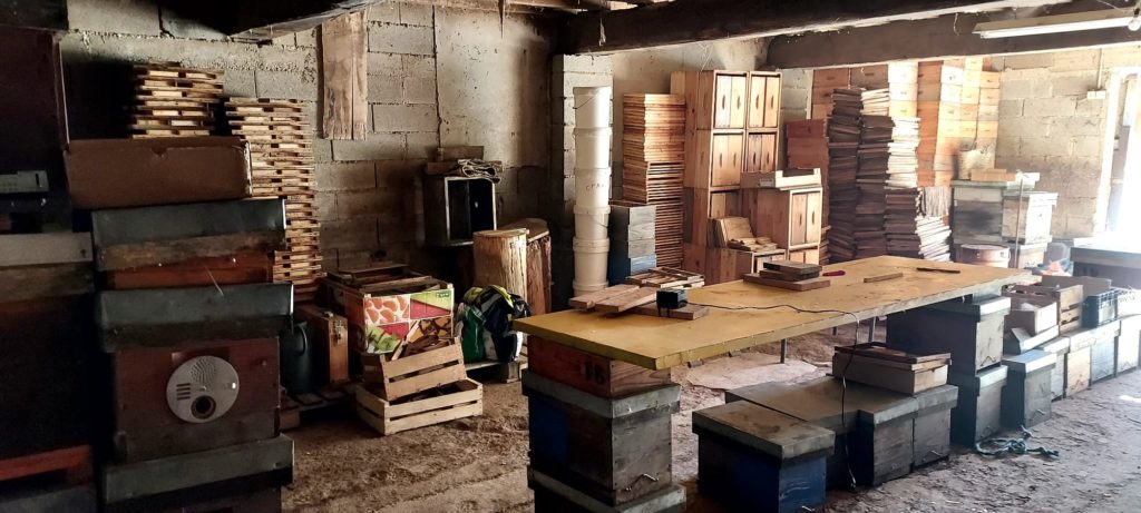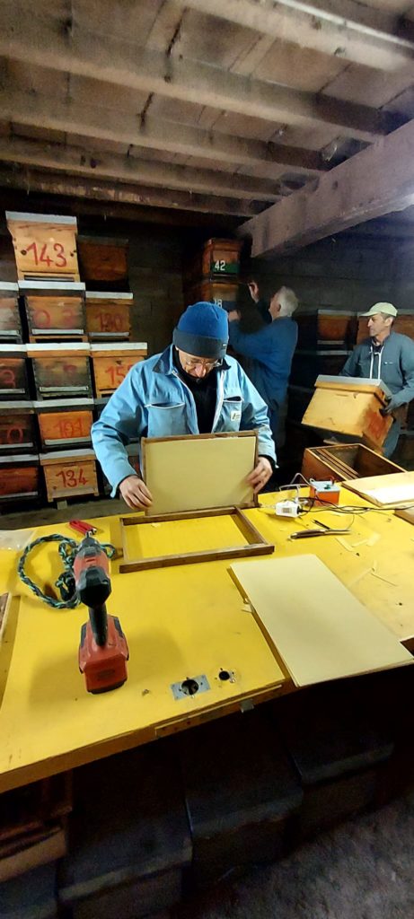 Dans notre nouveau local à Burges, nous avons pu nous préparer pour cette nouvelle saison apicole : nettoyage des ruches, passage au chalumeau, passage à l’huile de lin chauffée, rangement du local… et également, préparation des nouveaux cadres : pose du fil, pose de la cire gaufrée.